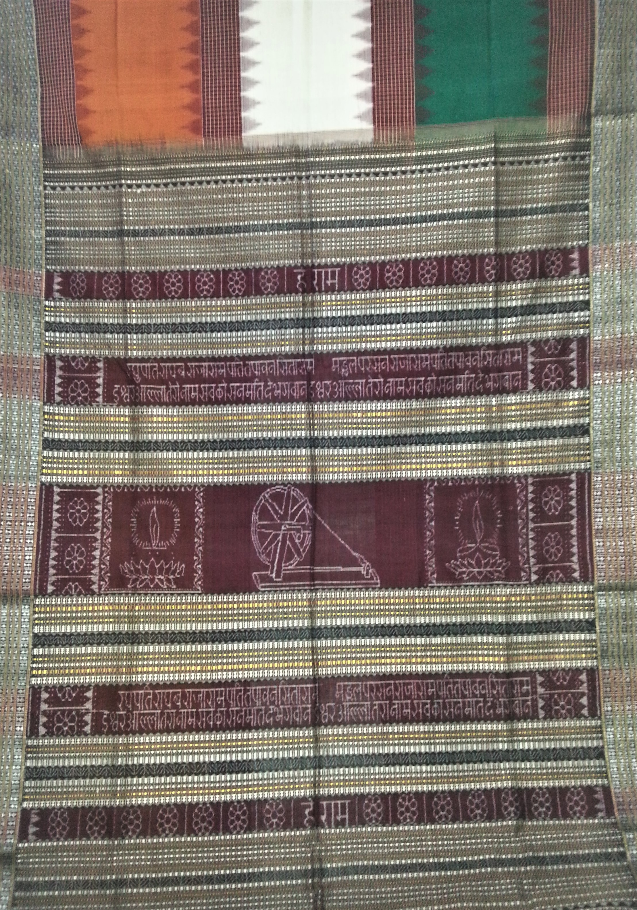 This saree design is based on Indian flag and Mahatma gandhi.